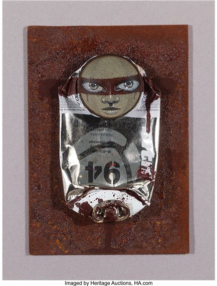 Acrylic on spray can mounted on rusted metal panel