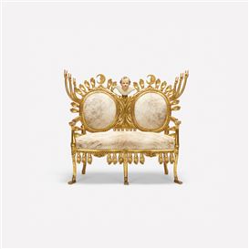 gilt and carved mahogany, cowhide, found object