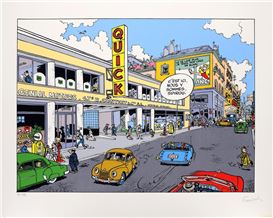 Spirou, sérigraphie "Le Garage Quick Super" n°78/199, signée (Ed. Champaka, 1995). Dimensions : 75 x 60.