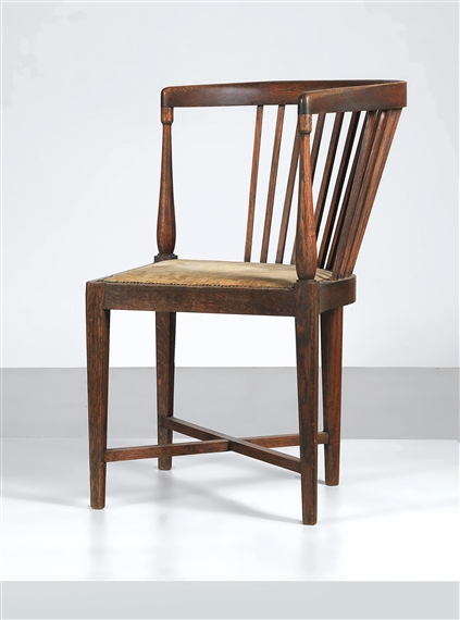 bluish grey stained ash frame on four legs, the seat upholstered and covered with light-coloured textile fabric